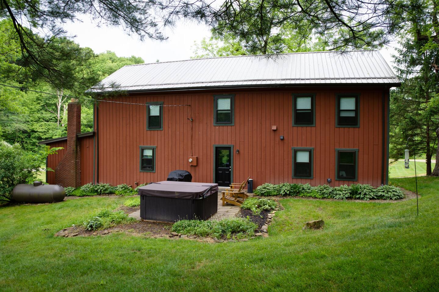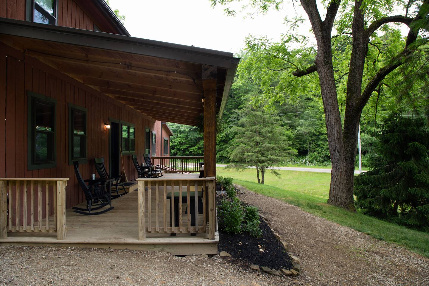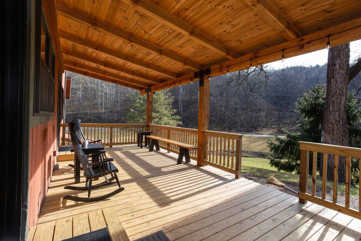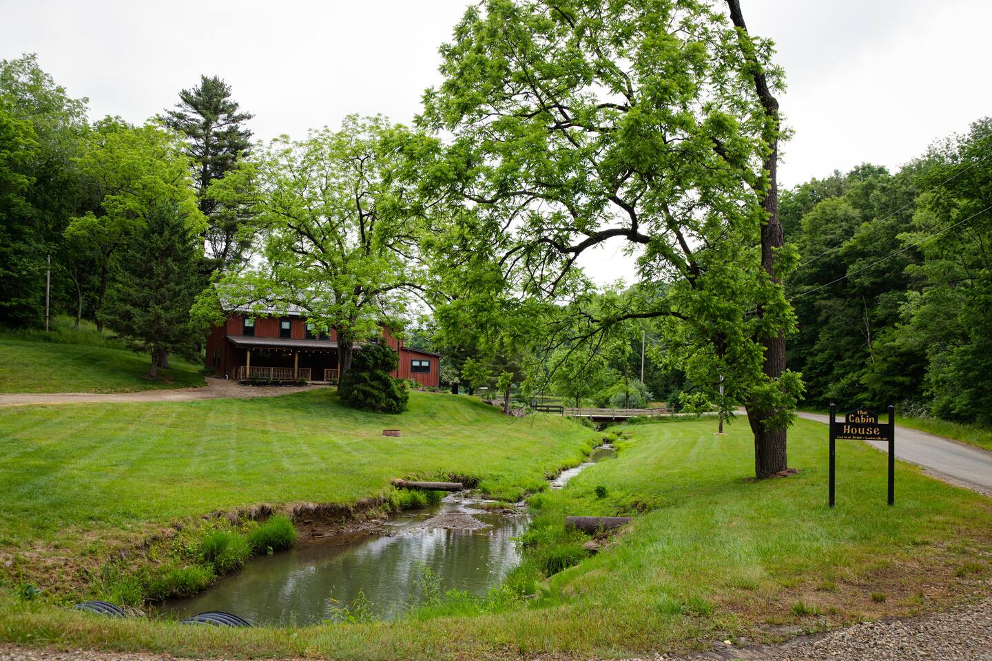 The property is a picturesque retreat nestled in a serene valley surrounded by wooded hills on both sides. Its idyllic location is further enhanced by a small creek running through the open grass yard in front of the cabin and a wood-covered hill to the rear. Relaxation is the order of the day with several rocking chairs on the front deck offering the perfect vantage point to soak up the tranquil setting. Alternatively, the back patio boasts a hot tub, gas grill, and Adirondack chairs where you can unwind and enjoy the fresh air. A fire ring in the front yard provides a cozy ambiance, but you'll need to bring your lawn chairs and firewood to enjoy it fully. As you enter through the front door, you'll be greeted by a spacious kitchen and dining area fully equipped to cater for your culinary needs. The island with a raised bar is a great spot to sit and eat, while the large dining table comfortably seats eight people with extra chairs and benches available for larger groups. The common area boasts two couches and three chairs where you can relax and socialize with your companions. For your entertainment, a 75" Smart Roku TV has been provided. This part of the house is the original 1830s cabin, which adds to the ambiance with its exposed logs and timbers. The game room has a table for playing any of the supplied games, and there are a couple of rocking chairs for quiet reading and relaxation. There is a private disc golf course on the property. We have one basket and 9 throwing locations. It is a small course but fairly challenging and lots of fun. We do provide some basic discs. The bedrooms have been thoughtfully designed to cater for different preferences. The master bedroom has a king bed and a half bath, while the second and third bedrooms also feature king beds. The loft area has two twin beds, a full bed, and a futon, but please be aware that access is via a steep ladder. For your convenience, there is a laundry room with a washer and dryer that you are welcome to use.
