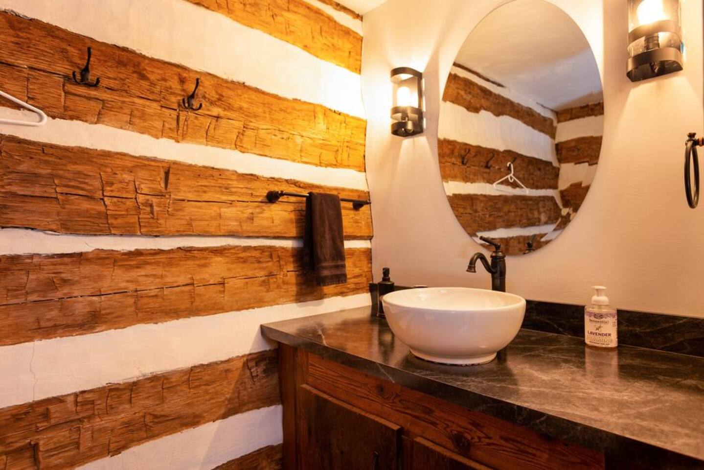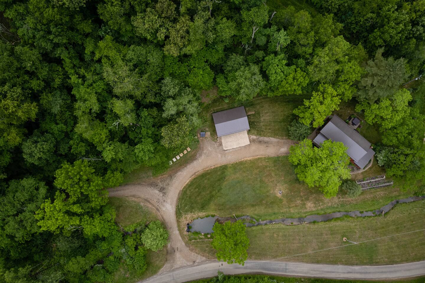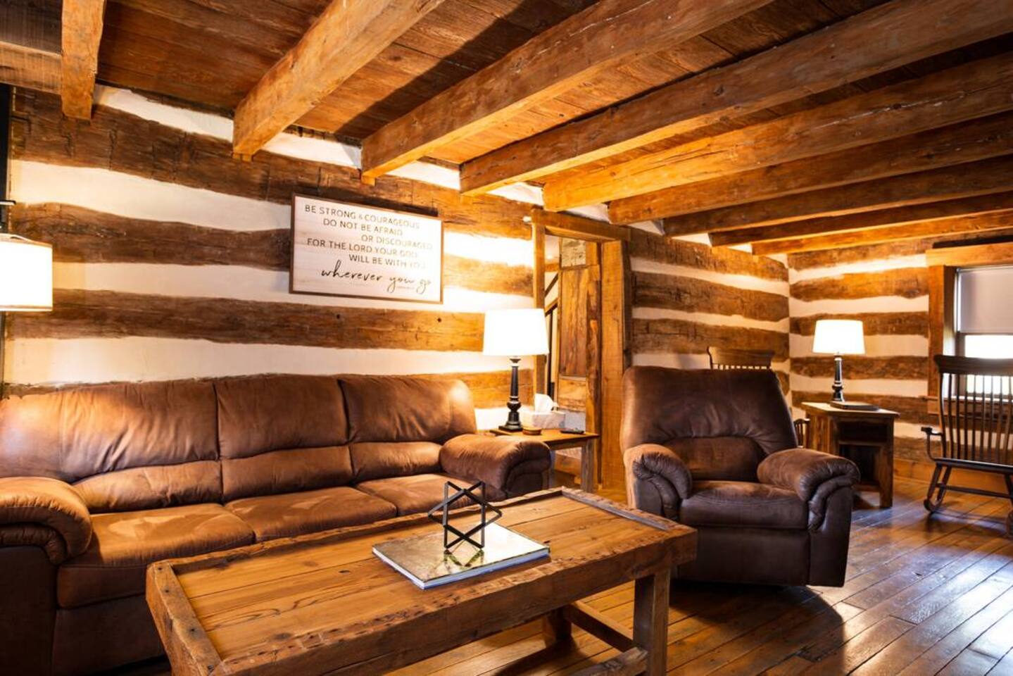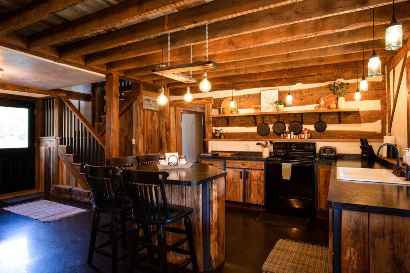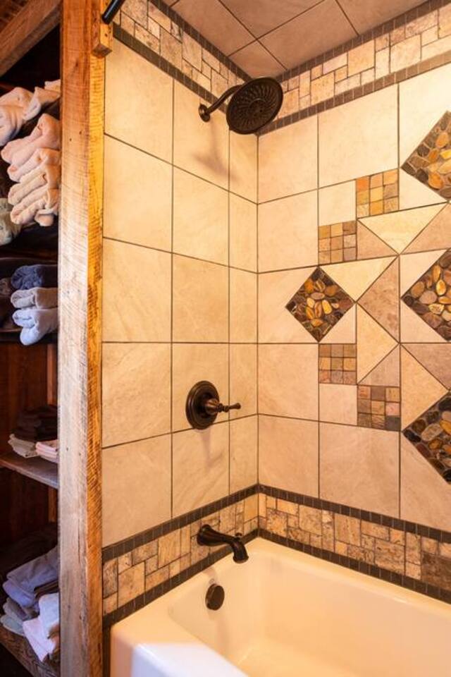 The property is a picturesque retreat nestled in a serene valley surrounded by wooded hills on both sides. Its idyllic location is further enhanced by a small creek running through the open grass yard in front of the cabin and a wood-covered hill to the rear. Relaxation is the order of the day with several rocking chairs on the front deck offering the perfect vantage point to soak up the tranquil setting. Alternatively, the back patio boasts a hot tub, gas grill, and Adirondack chairs where you can unwind and enjoy the fresh air. A fire ring in the front yard provides a cozy ambiance, but you'll need to bring your lawn chairs and firewood to enjoy it fully. As you enter through the front door, you'll be greeted by a spacious kitchen and dining area fully equipped to cater for your culinary needs. The island with a raised bar is a great spot to sit and eat, while the large dining table comfortably seats eight people with extra chairs and benches available for larger groups. The common area boasts two couches and three chairs where you can relax and socialize with your companions. For your entertainment, a 75" Smart Roku TV has been provided. This part of the house is the original 1830s cabin, which adds to the ambiance with its exposed logs and timbers. The game room has a table for playing any of the supplied games, and there are a couple of rocking chairs for quiet reading and relaxation. There is a private disc golf course on the property. We have one basket and 9 throwing locations. It is a small course but fairly challenging and lots of fun. We do provide some basic discs. The bedrooms have been thoughtfully designed to cater for different preferences. The master bedroom has a king bed and a half bath, while the second and third bedrooms also feature king beds. The loft area has two twin beds, a full bed, and a futon, but please be aware that access is via a steep ladder. For your convenience, there is a laundry room with a washer and dryer that you are welcome to use.